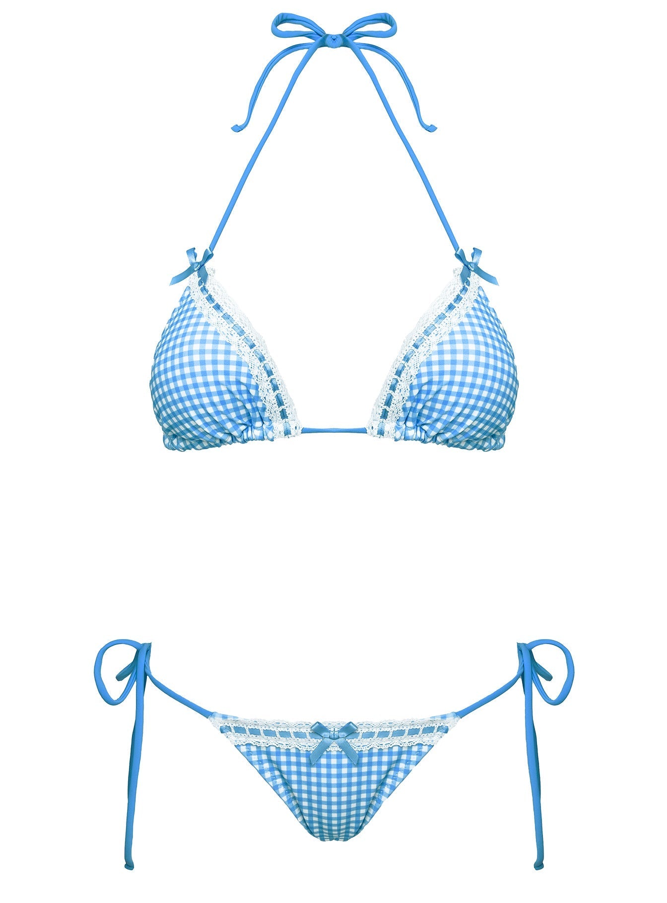 - Lace trim, bow detail, fixed coverage, tie-side fastenings, cheeky bottoms